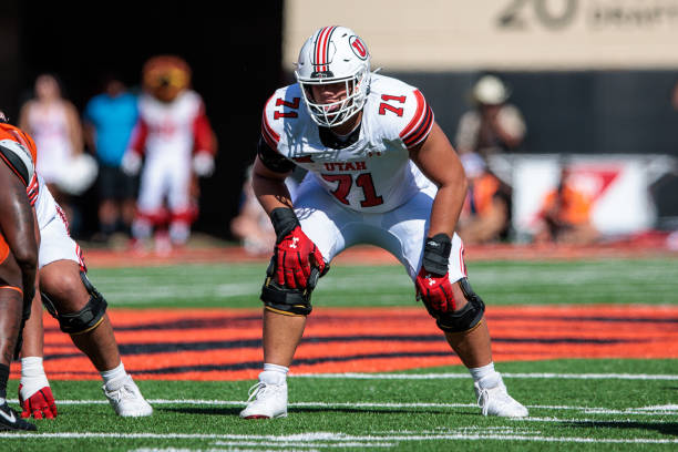 STILLWATER, OK – SEPTEMBER 21: Utah Utes offensive lineman Caleb Lomu (71) on the field against the Oklahoma State Cowboys on September 21st, 2024 at Boone Pickens Stadium in Stillwater, Oklahoma. (Photo by WJ/Icon Sportswire via Getty Images)