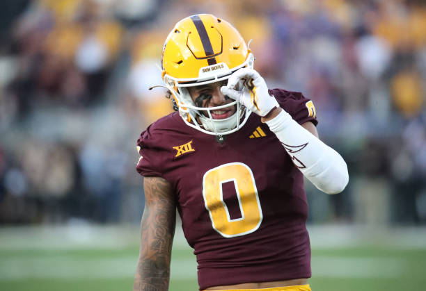 TEMPE, ARIZONA – NOVEMBER 23: Jordyn Tyson #0 of the ASU Sun Devils celebrates after Cougars turn over the ball in the fourth quarter of the BYU Cougars versus the Arizona State Sun Devils football game at Mountain America Stadium on November 23, 2024 in Tempe, Arizona. (Photo by Bruce Yeung/Getty Images)
