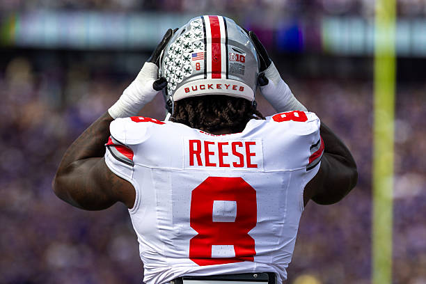 SEATTLE, WASHINGTON – SEPTEMBER 27: Arvell Reese #8 of the Ohio State Buckeyes puts on his helmet against the Washington Huskies at Husky Stadium on September 27, 2025 in Seattle, Washington. (Photo by Tom Hauck/Getty Images)