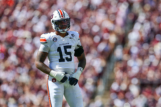 COLLEGE STATION, TEXAS – SEPTEMBER 27: Keldric Faulk #15 of the Auburn Tigers lines up on the line of scrimmage during the first half against the Texas A&M Aggies at Kyle Field on September 27, 2025 in College Station, Texas. (Photo by Aaron M. Sprecher/Getty Images)