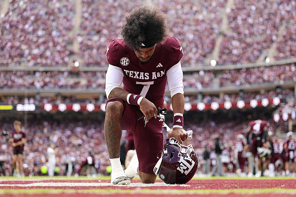 COLLEGE STATION, TEXAS – NOVEMBER 15: KC Concepcion #7 of the Texas A&M Aggies takes a knee in the end zone before playing the South Carolina Gamecocks during the first quarter at Kyle Field on November 15, 2025 in College Station, Texas. (Photo by Alex Slitz/Getty Images)