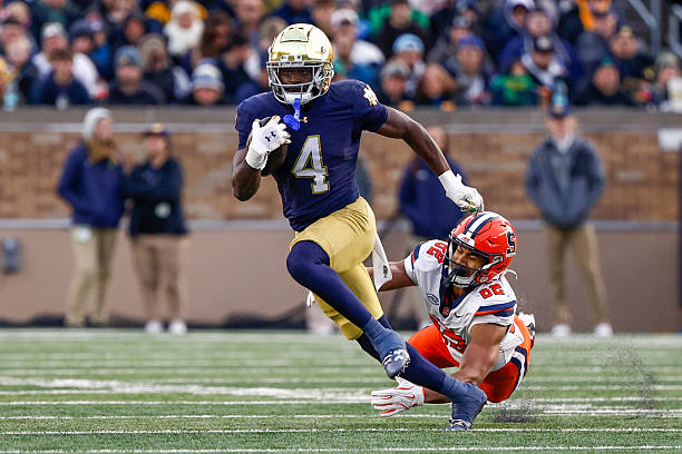 SOUTH BEND, IN – NOVEMBER 22: Jeremiyah Love #4 of the University of Notre Dame runs with the ball past the diving tackle attempt of Jamie Tremble #82 of Syracuse University during a game between Syracuse University and University of Notre Dame at Notre Dame Stadium on November 22, 2025 in South Bend, Indiana. (Photo by Michael Miller/ISI Photos/ISI Photos via Getty Images)