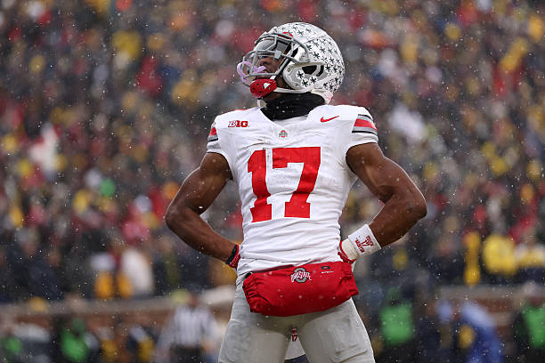 ANN ARBOR, MICHIGAN – NOVEMBER 29: Carnell Tate #17 of the Ohio State Buckeyes celebrates after a touchdown during the third quarter against the Michigan Wolverines at Michigan Stadium on November 29, 2025 in Ann Arbor, Michigan. (Photo by Luke Hales/Getty Images)