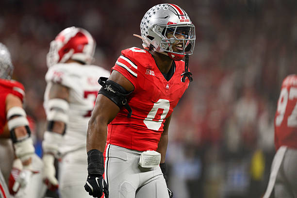 INDIANAPOLIS, IN – DECEMBER 06: Ohio State Buckeyes linebacker Sonny Styles (0) celebrates during the Big 10 Championship game between the Ohio State Buckeyes and Indiana Hoosiers on December 6, 2025, at Lucas Oil Stadium in Indianapolis, IN. (Photo by Zach Bolinger/Icon Sportswire via Getty Images)