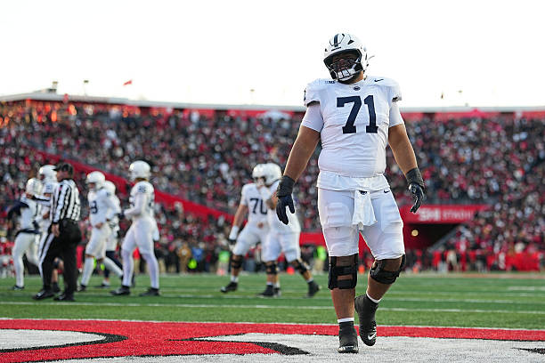PISCATAWAY, NEW JERSEY – NOVEMBER 29: Olaivavega Ioane #71 of the Penn State Nittany Lions looks on against the Rutgers Scarlet Knights at SHI Stadium on November 29, 2025 in Piscataway, New Jersey. The Penn State Nittany Lions defeated the Rutgers Scarlet Knights 40-36. (Photo by Mitchell Leff/Getty Images)