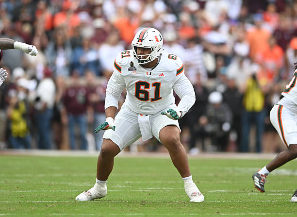 COLLEGE STATION, TX – DECEMBER 20: Miami Hurricanes lineman Francis Mauigoa blocks during College Football Playoff game featuring the Miami Hurricanes and the Texas A&M Aggies on December 20, 2025 at Kyle Field in College Station, TX (Photo by John Rivera/Icon Sportswire via Getty Images)