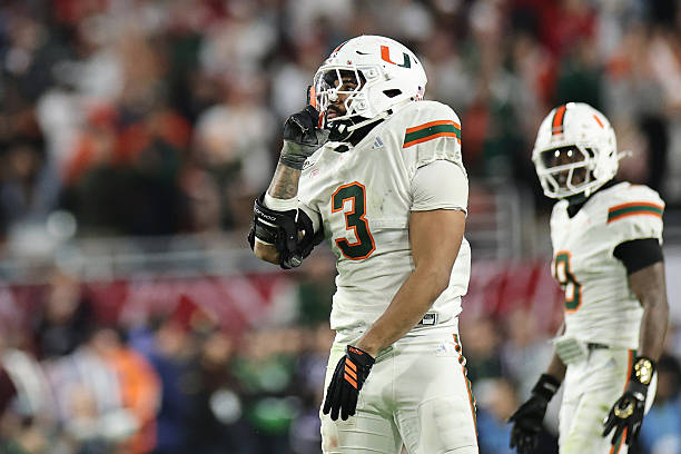 MIAMI GARDENS, FLORIDA – JANUARY 19: Akheem Mesidor #3 of the Miami Hurricanes reacts after sacking Fernando Mendoza #15 of the Indiana Hoosiers during the third quarter in the 2026 College Football Playoff National Championship at Hard Rock Stadium on January 19, 2026 in Miami Gardens, Florida. (Photo by Carmen Mandato/Getty Images)